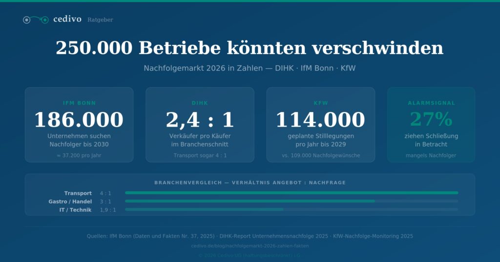 Das Institut für Mittelstandsforschung (IfM) Bonn schätzt in seiner aktuellen Studie „Unternehmensnachfolgen in Deutschland 2026 bis 2030″ (Daten und Fakten Nr. 37, 2025), dass in diesem Zeitraum rund 186.000 Unternehmen zur Übergabe anstehen, etwa 37.200 pro Jahr.